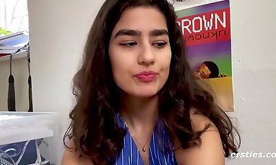 New and cute brunette Rosalyn Sphinx flashes her pubic hair before giving BJ