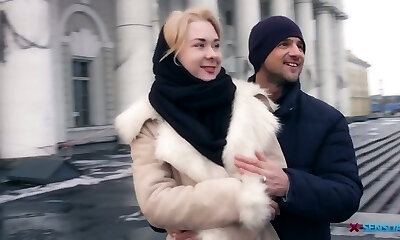 Stunning blondie in black sundress hooks up with a guy and goes with him