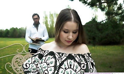 Pale platinum-blonde doll Layla Belle masturbates and gets fucked in the woods