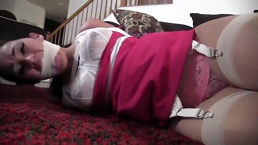 Huge-chested dark-haired strokes off in antique nylons garters high-heeled shoes