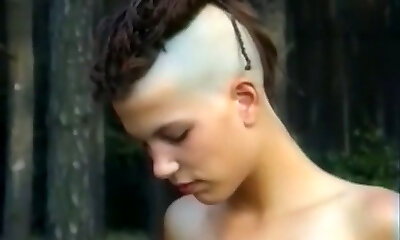 Skinny and tall punk girl with two horny fellows in the forest